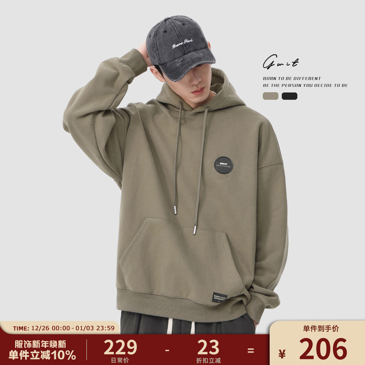 GWIT 重磅复古潮牌刺绣冬季保暖套头打底帽衫加绒加厚连帽卫衣男
