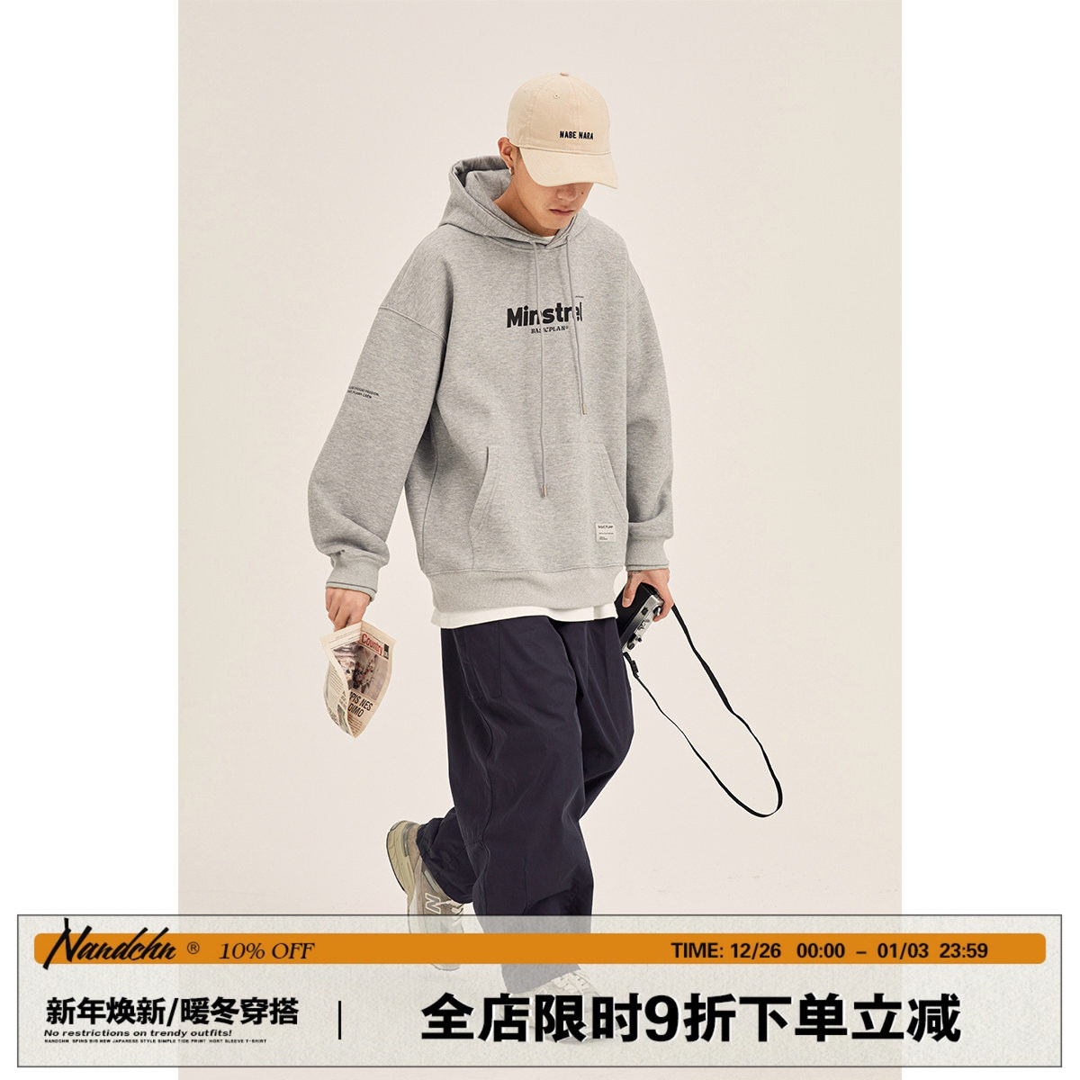男道秋冬新款小字母重磅连帽薄款卫衣男美式复古加绒灰色套头帽衫