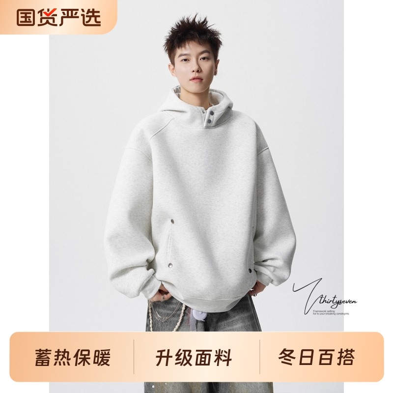 V37美式重磅廓形按扣连帽卫衣男款秋季高街痞帅拼接加绒套头帽衫