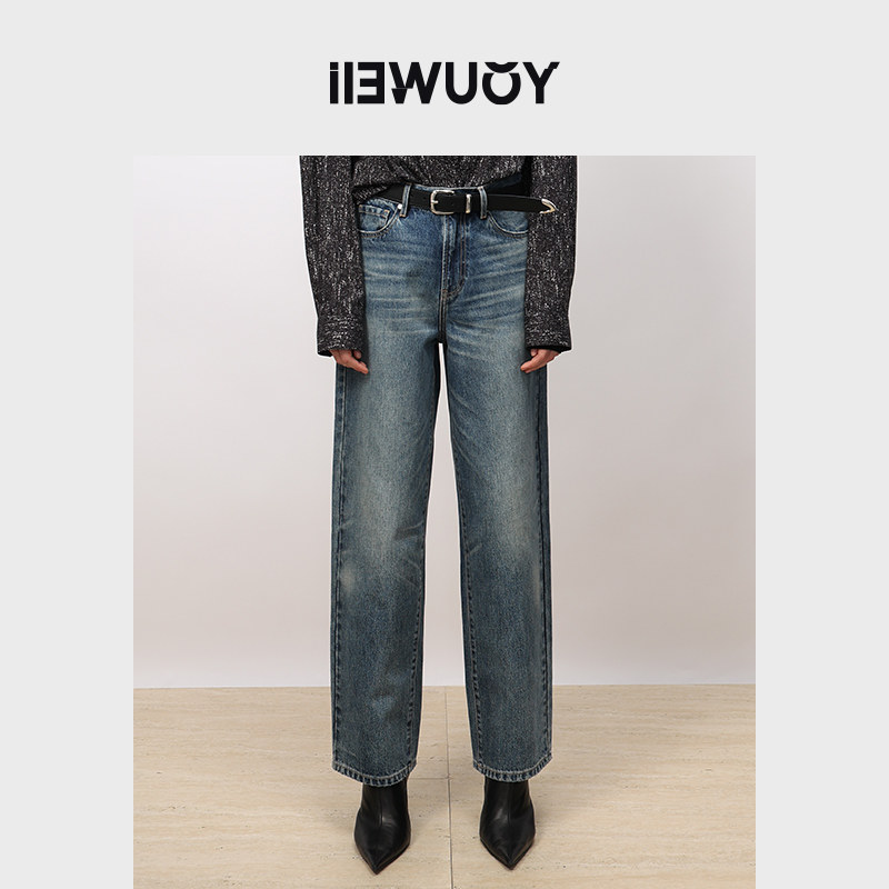 艾莱依2025秋季新款直筒牛仔裤女士做旧复古高腰宽松型显瘦阔腿裤