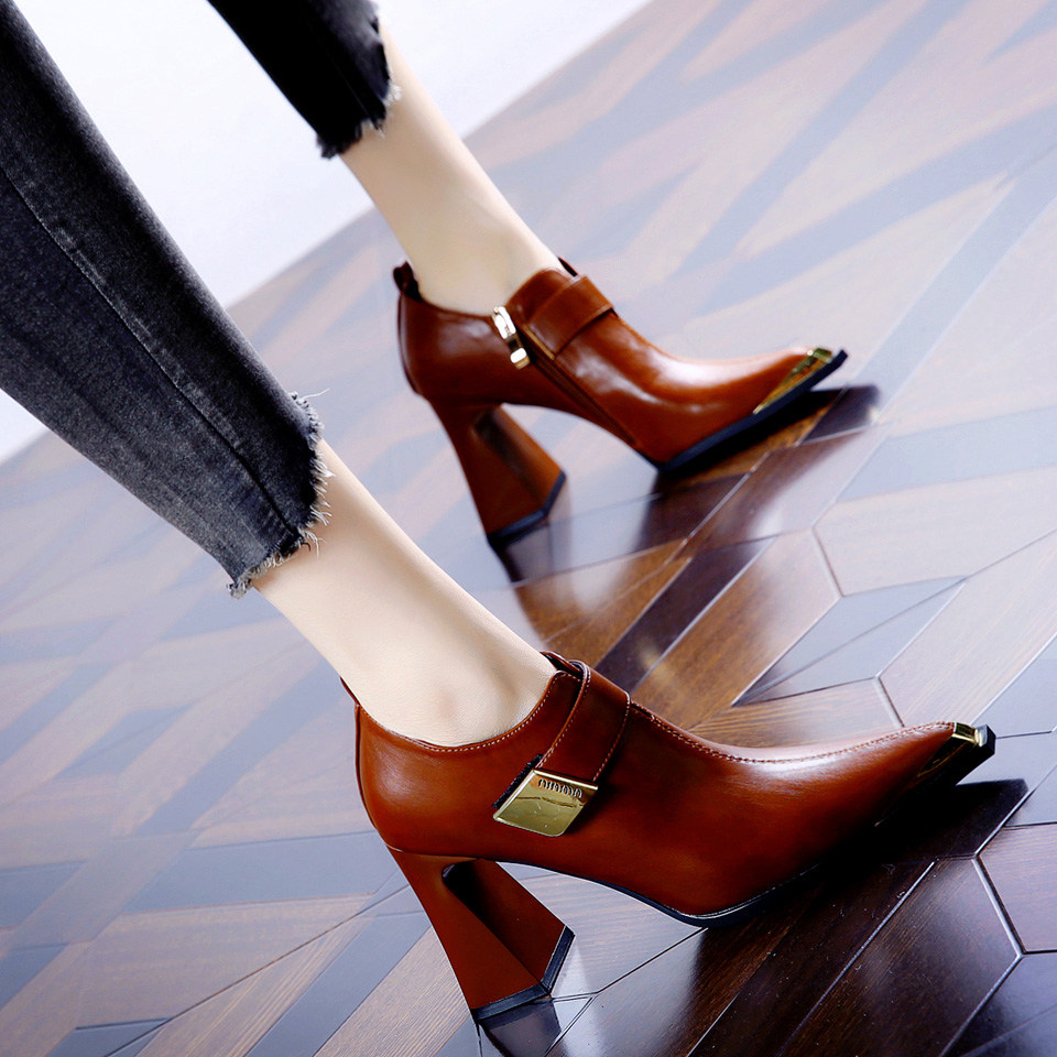 高跟及踝靴女尖头英伦风2025年秋秋季加绒时尚金属扣深口粗跟单鞋
