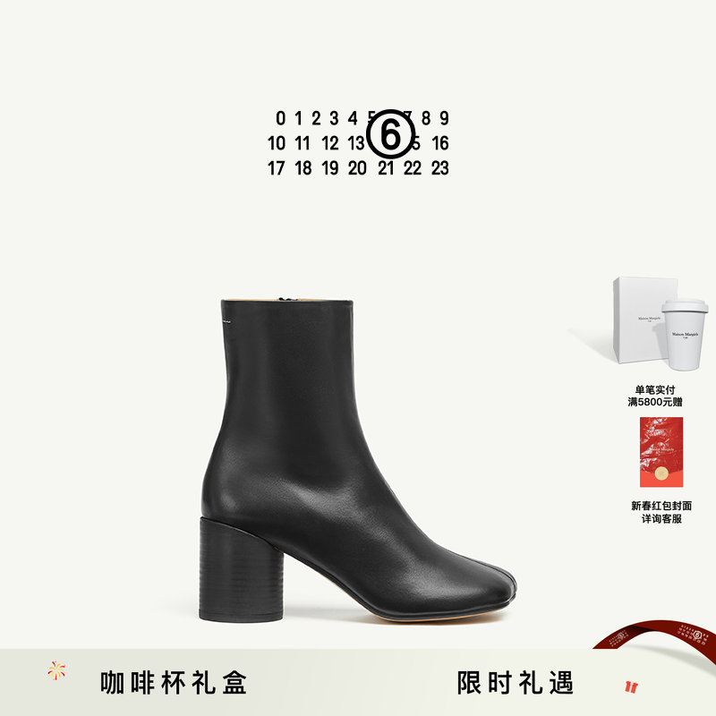 MM6黑色女士粗高跟羊皮革及踝靴中筒靴7cm时尚休闲通勤女鞋皮鞋