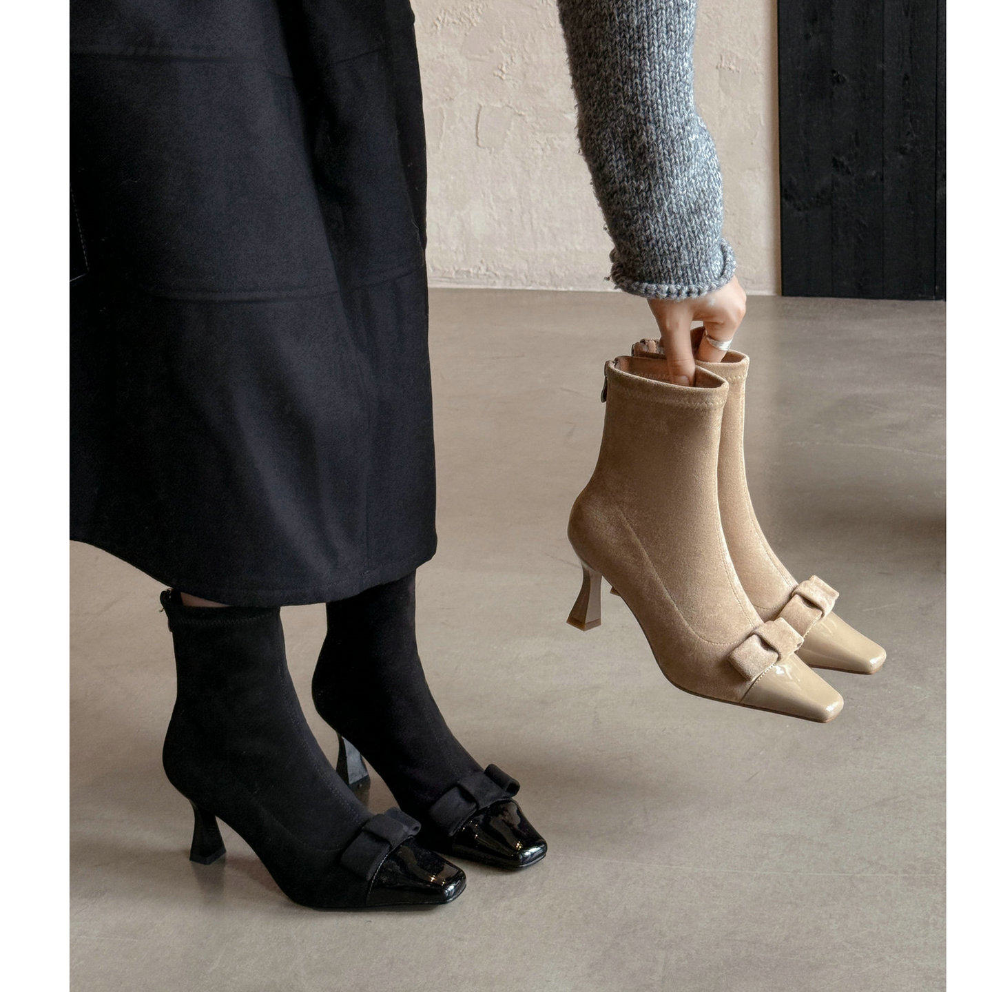 蝴蝶结高跟短靴女2025年新款方头细跟气质及踝靴法式弹力瘦瘦靴子
