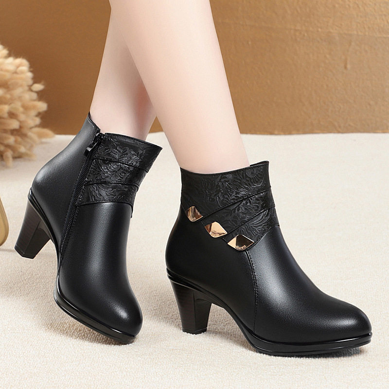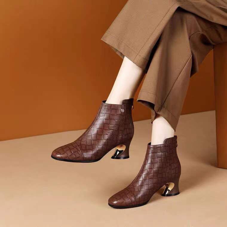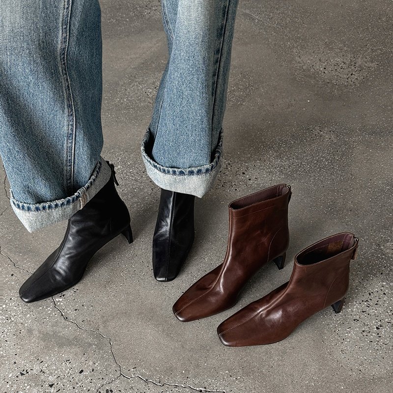 气质方头高跟及踝靴短靴女真皮2025秋冬新款粗跟后拉链靴子M146