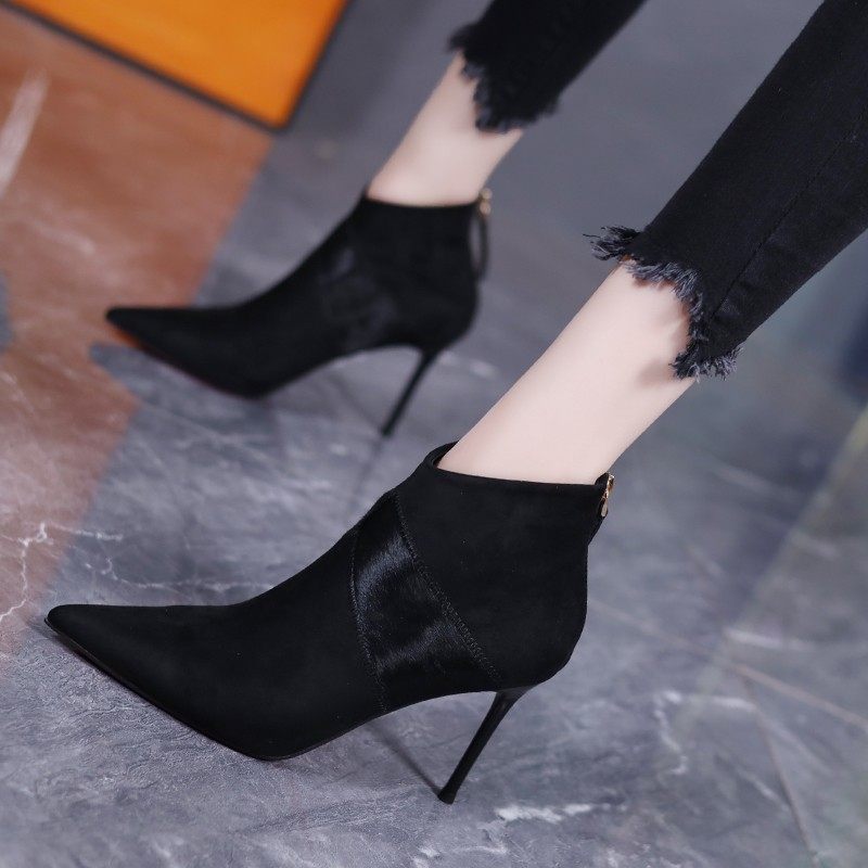 高跟短靴女绒面翻毛皮水貂毛尖头磨砂真皮细跟裸靴及踝靴秋冬加绒