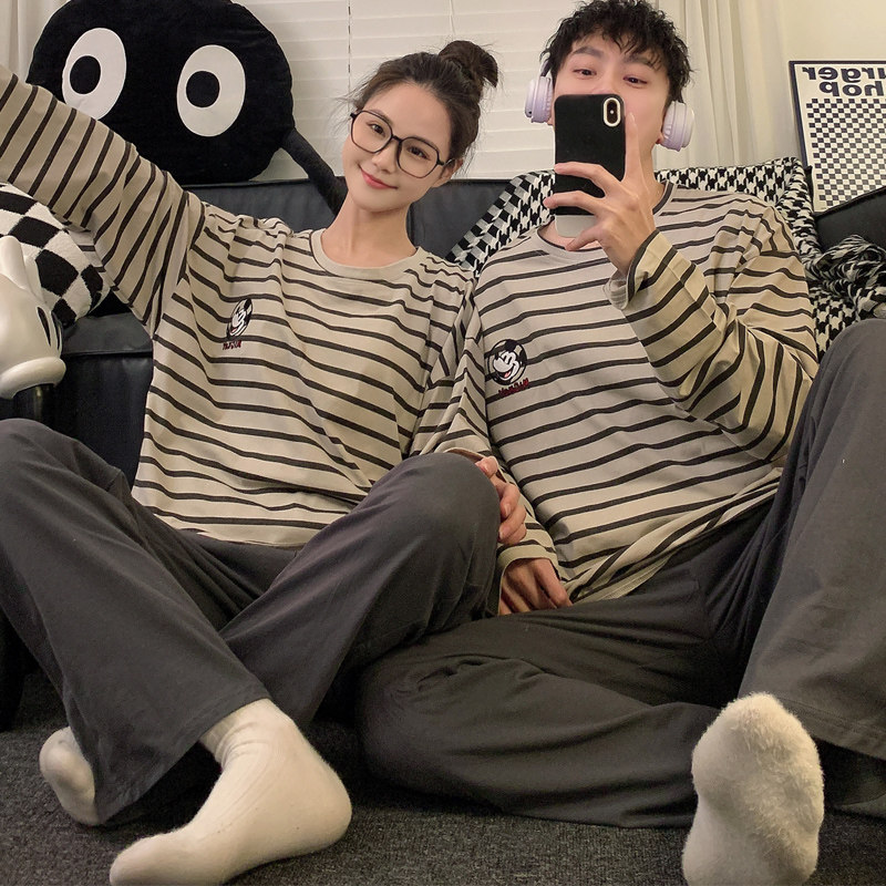 韩版条纹米奇情侣睡衣女春秋季纯棉长袖宽松休闲外穿家居服套装男
