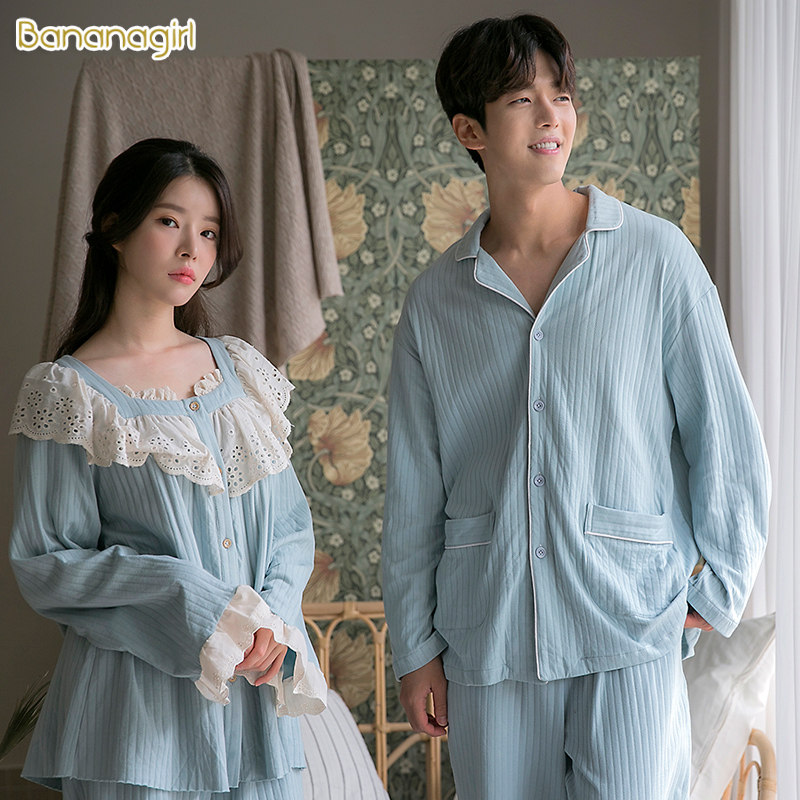 Bananagirl情侣睡衣女纯棉韩版甜美家居服长袖纯色男士可外穿套装