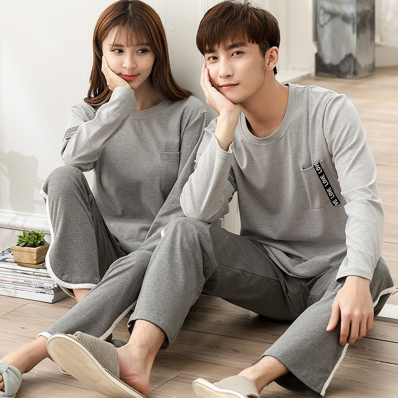 韩版高级感灰色春秋季新款纯棉长袖情侣睡衣男女士宽松套装家居服