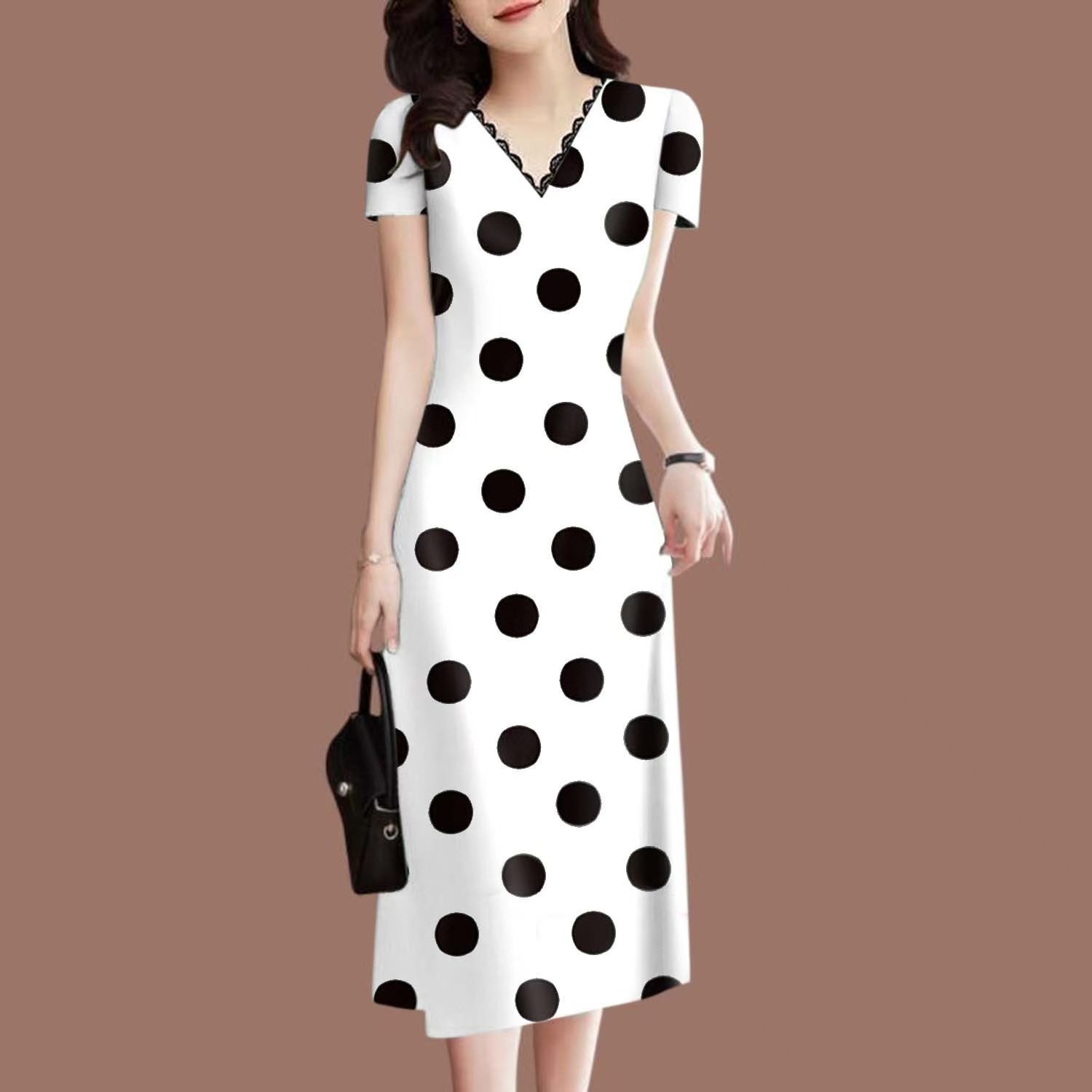 高级感气质波点短袖白色连衣裙女士夏季新款时尚圆点v领中长裙子