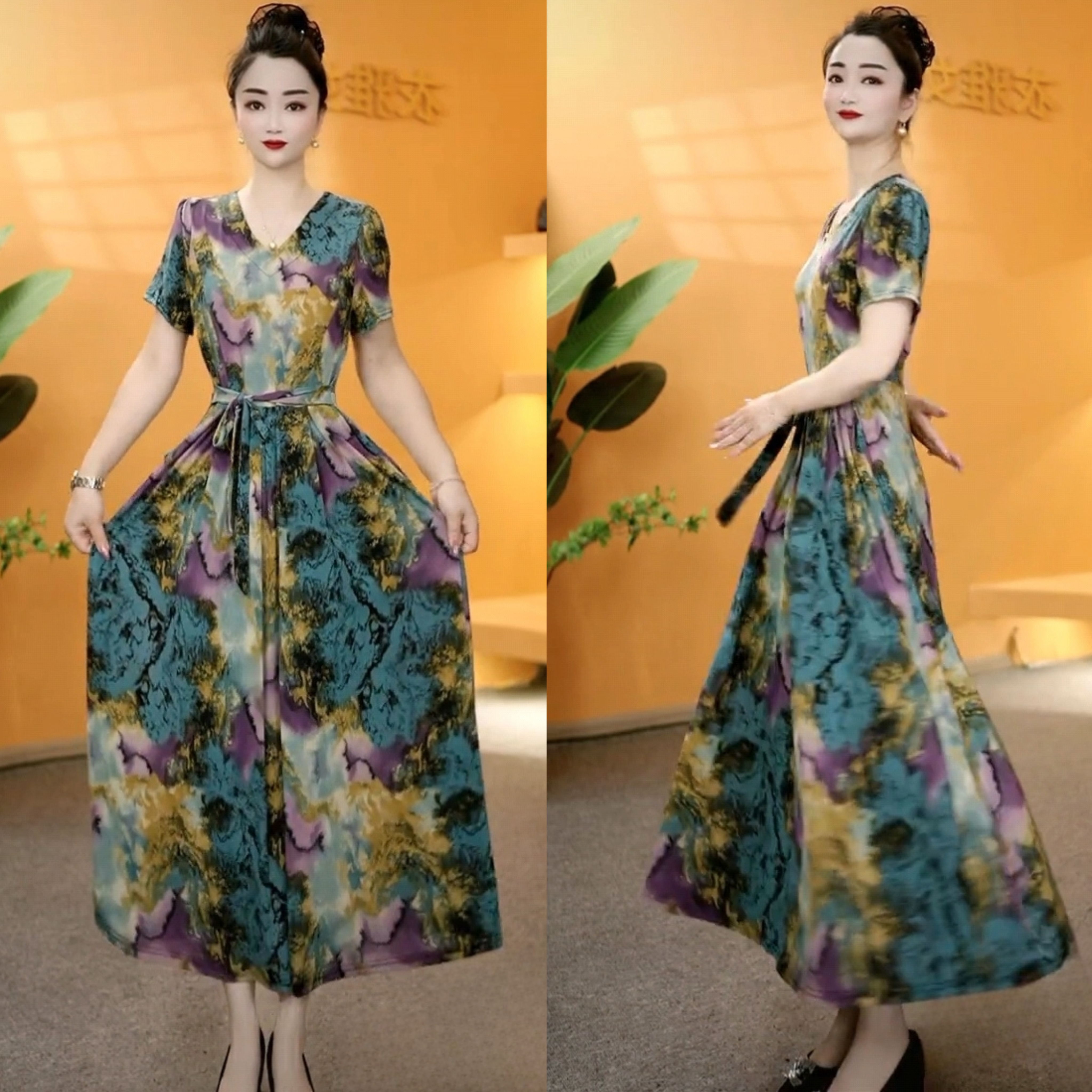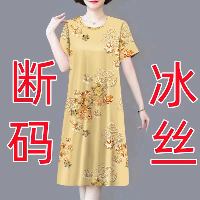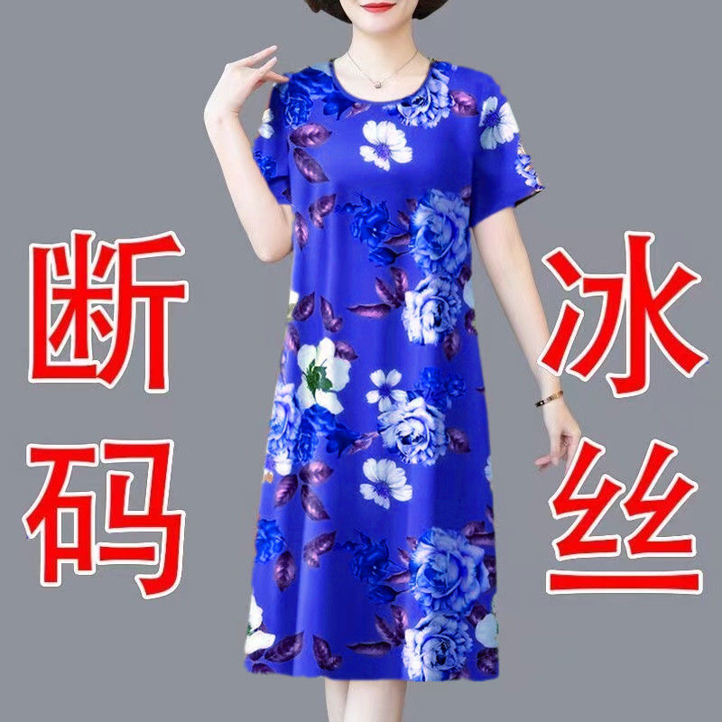 中老年短袖连衣裙女冰丝2025新款时尚印花妈妈装女士宽松款中长裙