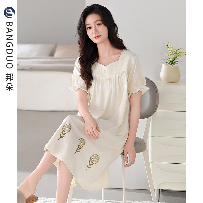 芬腾女士睡裙夏季纯棉短袖睡衣中长裙新款透气可外穿家居服连衣裙