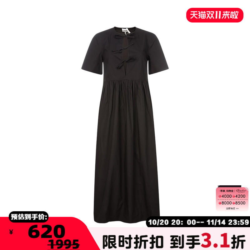 GANNI春季黑色棉质蝴蝶结绑带镂空女士短袖连衣裙长裙银泰百货
