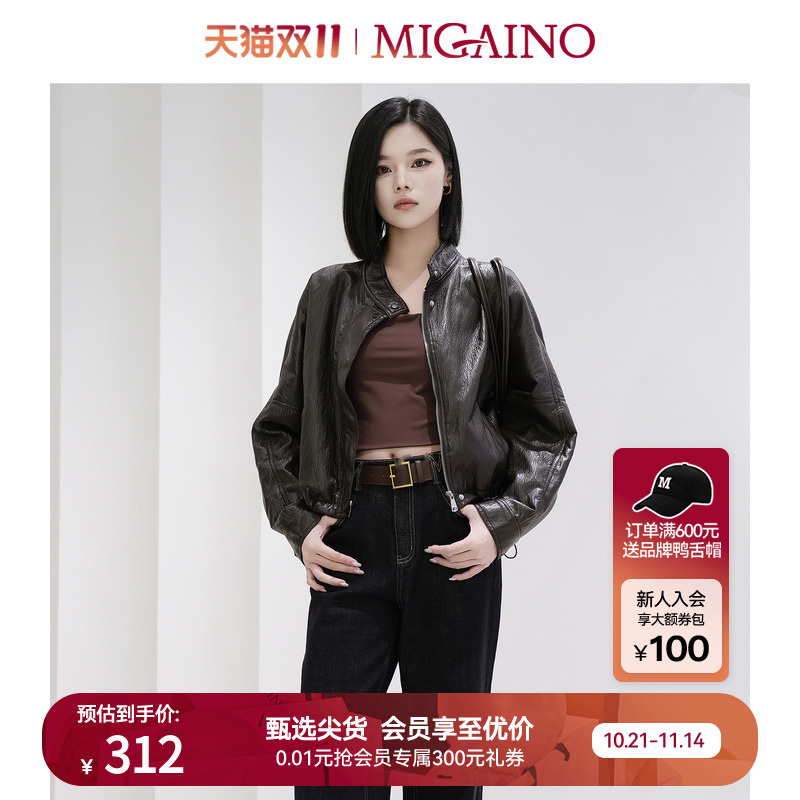 Migaino曼娅奴女装秋冬新款机车酷飒风立领短款夹克PU皮衣外套