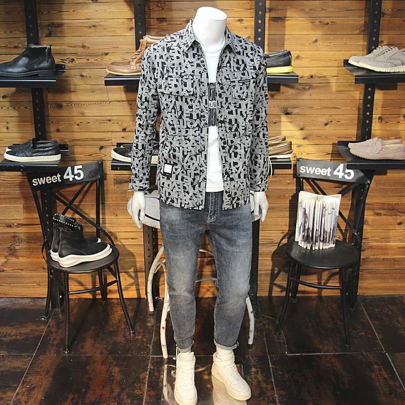 春秋印花男衬衣外套潮款青年帅气翻领外穿衬衫夹克春秋花色男外衣