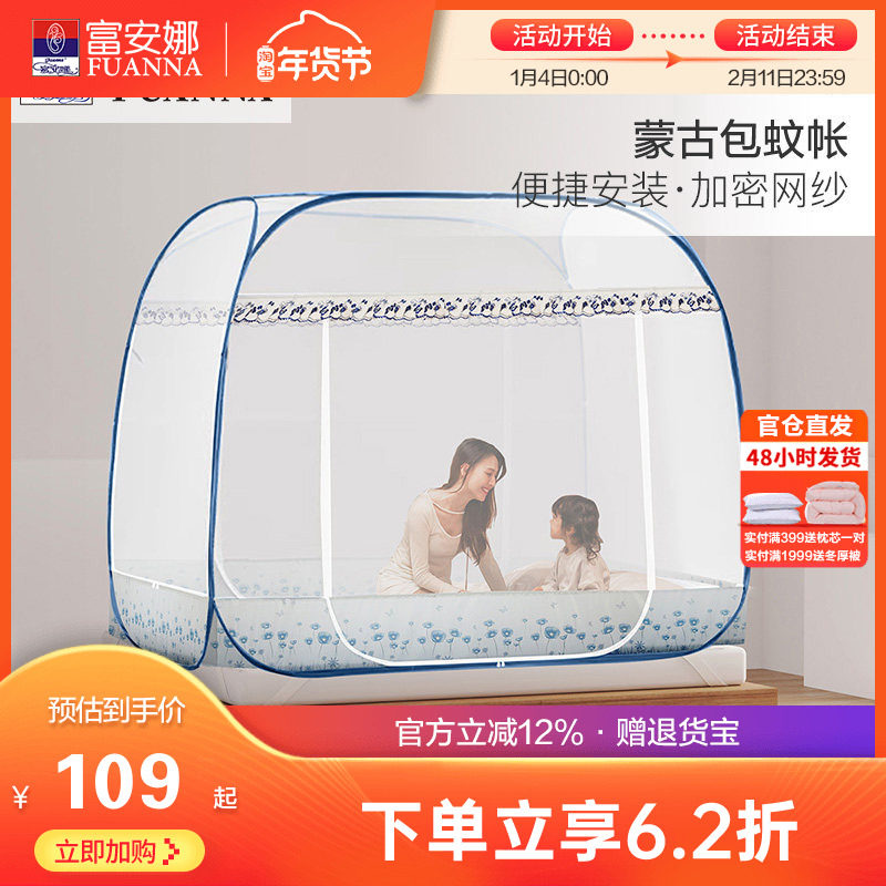 富安娜蒙古包双开门1.5米加密加厚有底蚊帐1.8m床双人家用免安装