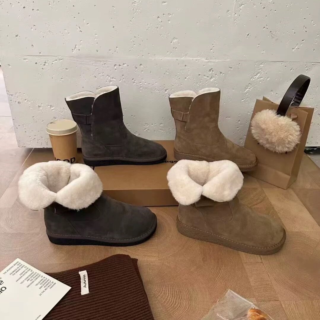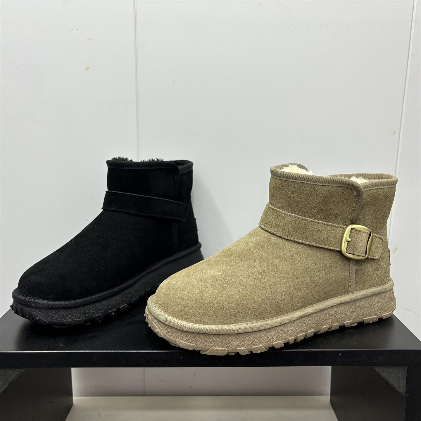 韩国冬新款皮带扣短靴真皮毛一体厚底休闲短筒雪地靴加厚保暖棉鞋