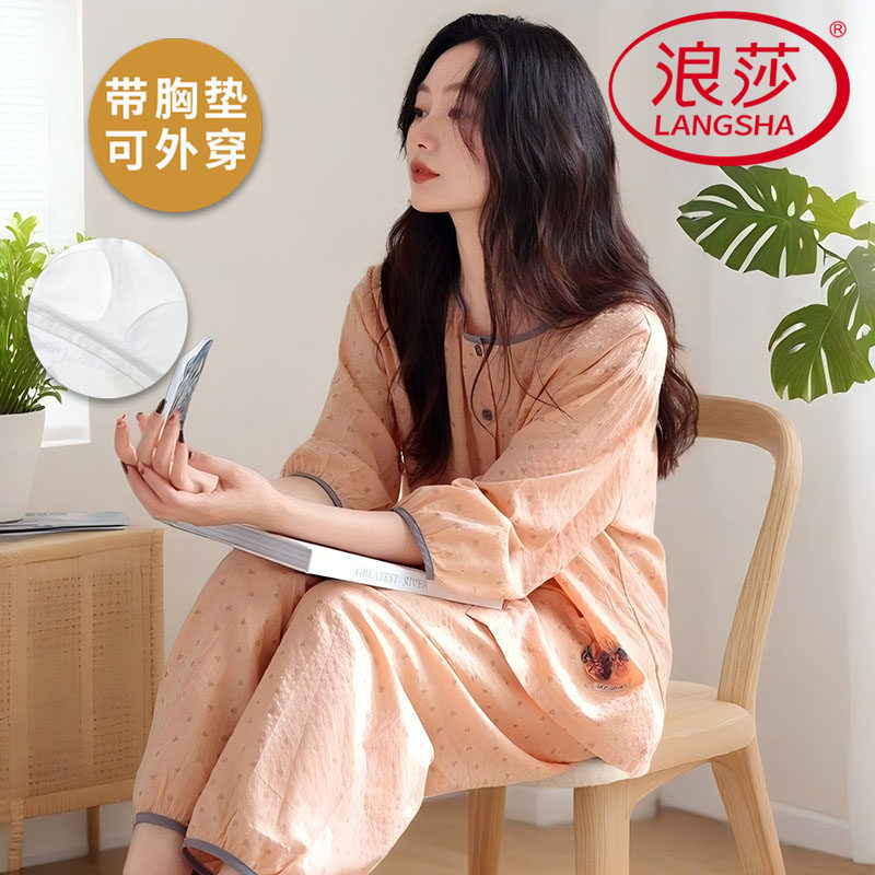 浪莎带胸垫睡衣女夏季云朵棉七分袖九分裤韩范家居服薄款两件套装