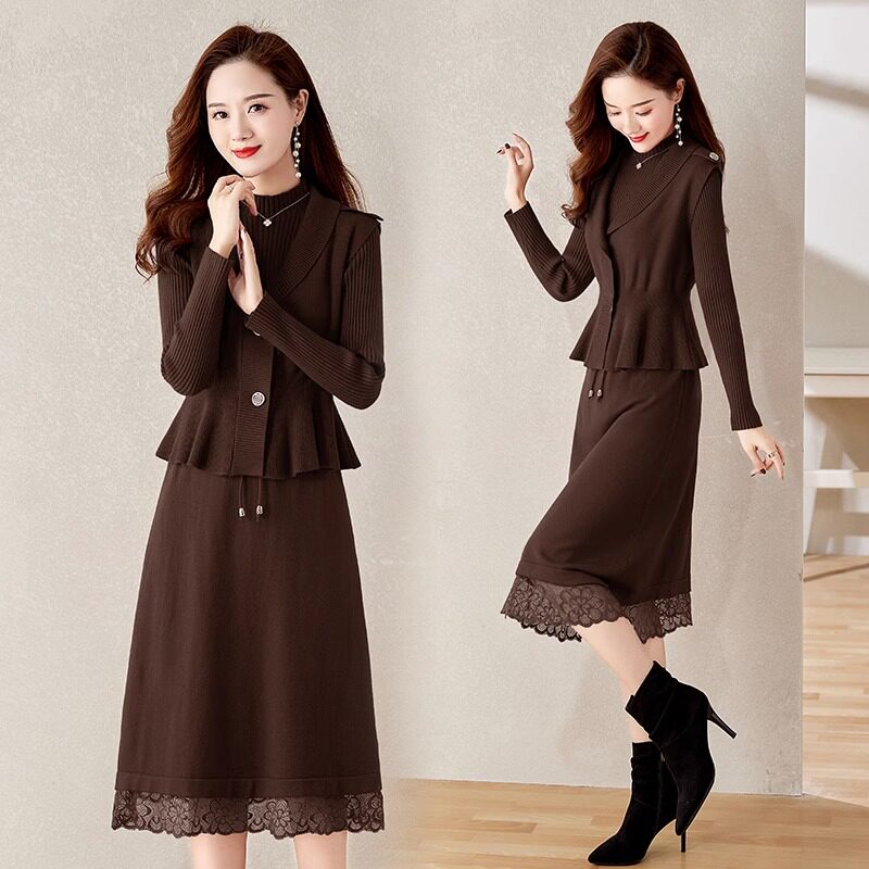 新款套装羊毛衫女秋冬款裙子中长款加厚俩件套韩版纯色女装连衣裙