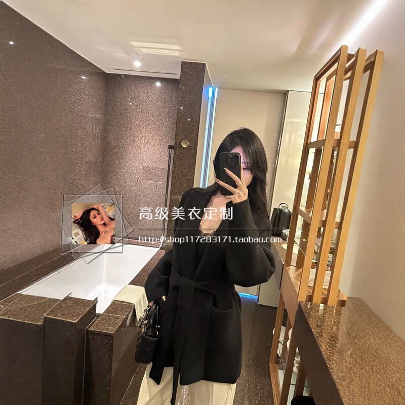 御姐高级感气质中长款针织毛衣开衫秋冬款宽松慵懒系带黑色外套女