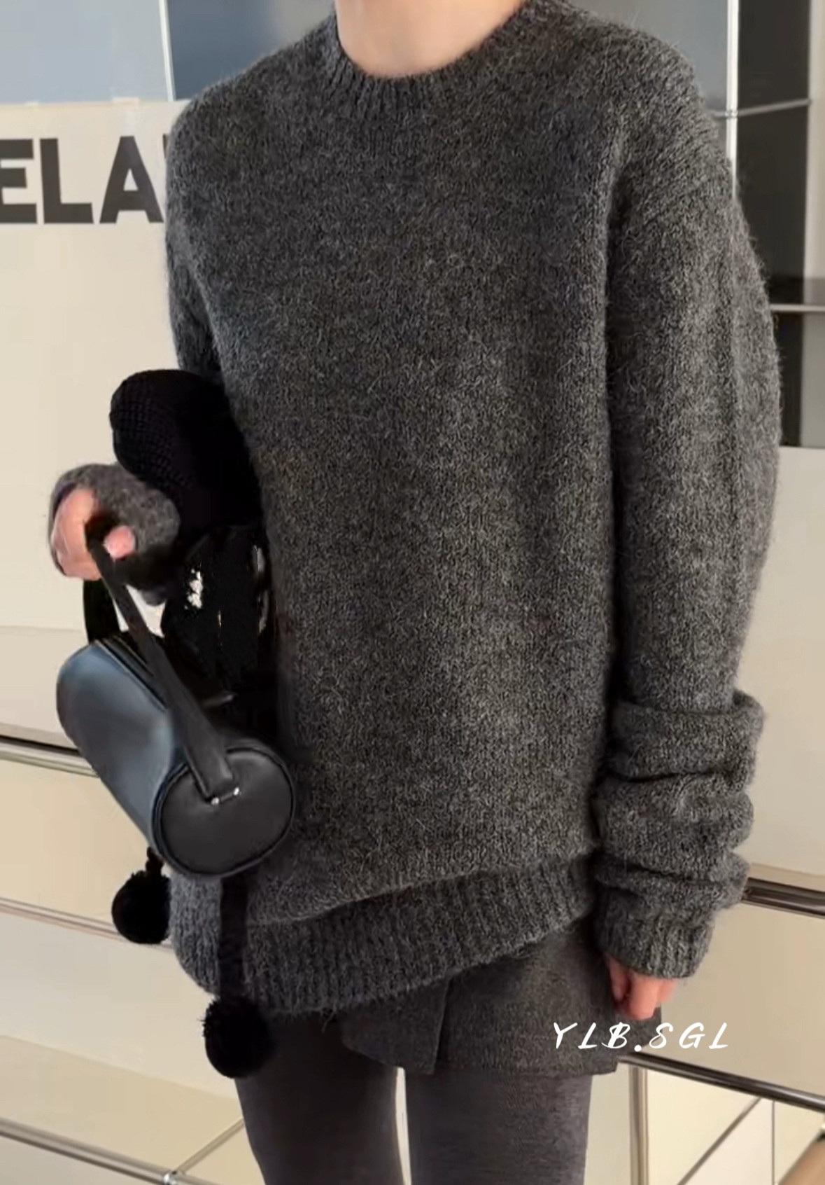 现货25036诗歌兰女装2025秋冬款 气质深灰色圆领中长款羊毛毛衣女