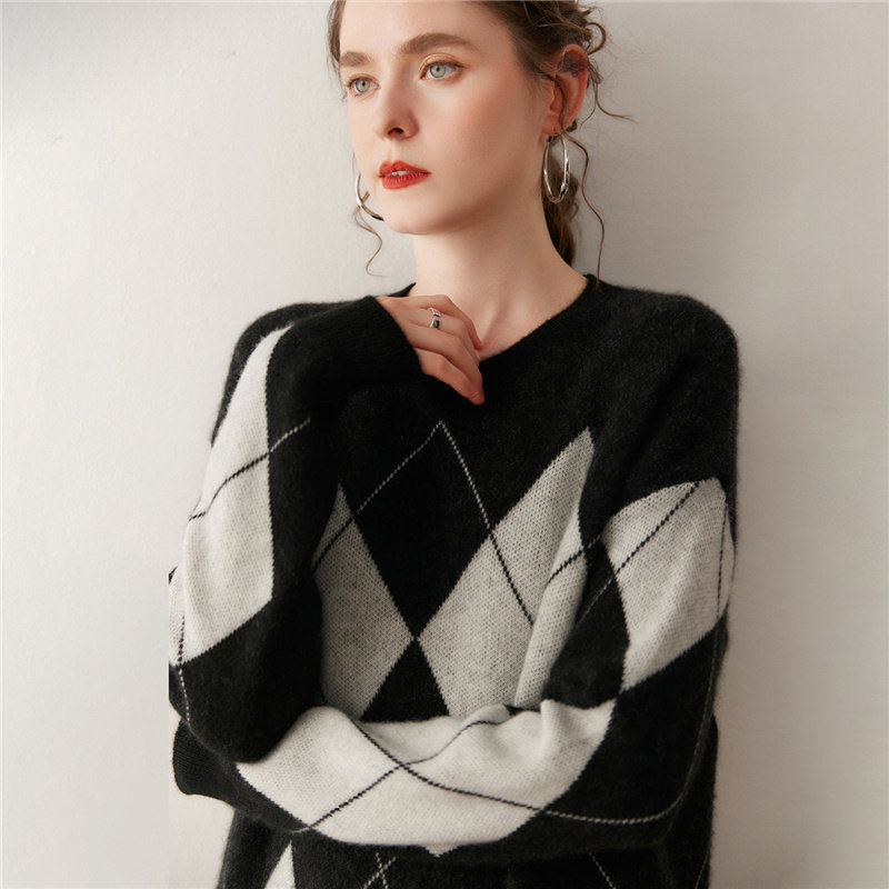 2025秋冬款100山羊绒针织衫女圆领七针双股加厚中长款菱形块毛衣