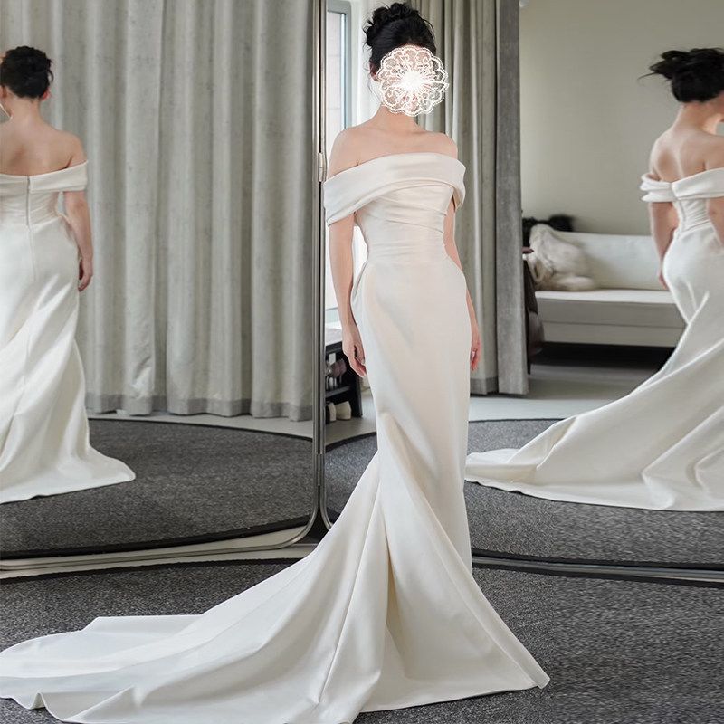 褶皱缎面主婚纱2025新款订婚出门纱礼服新娘抹胸鱼尾大蝴蝶结赫本