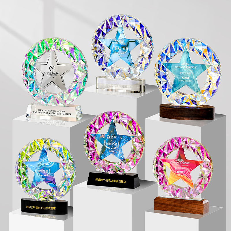 新款高档彩色水晶奖杯奖牌定制斜面板五角星年会优秀员工颁奖纪念