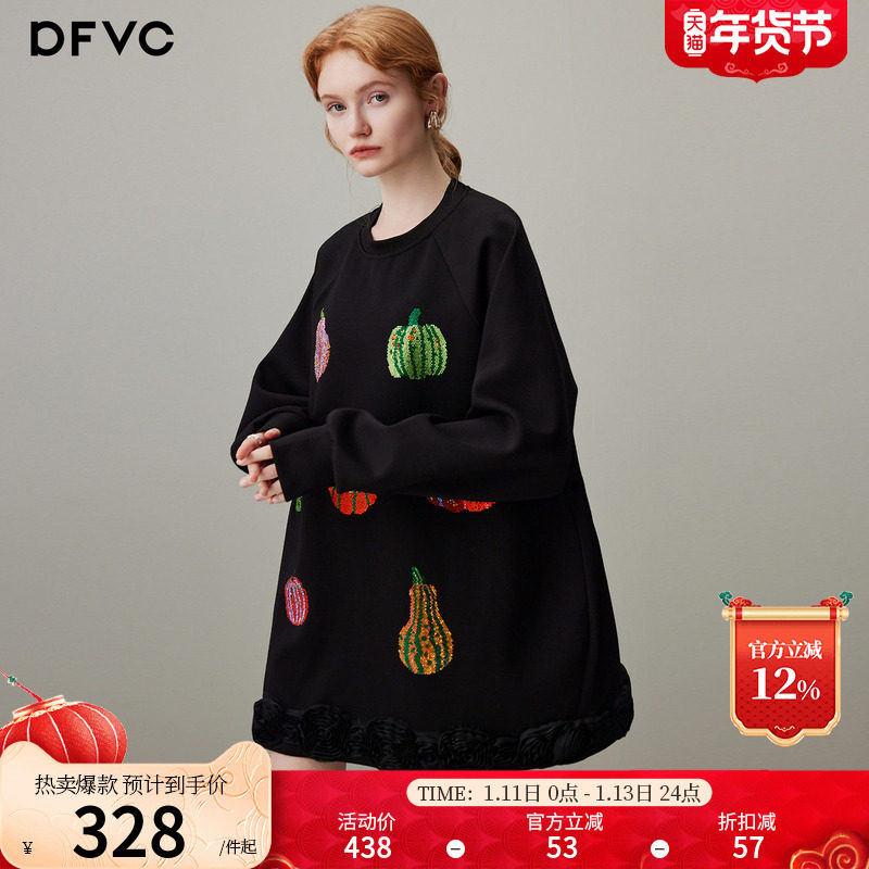 dfvc黑色重工烫钻圆领卫衣裙女2025年冬季新款宽松休闲长袖连衣裙