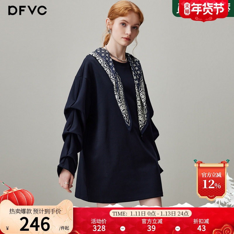 dfvc韩系休闲圆领卫衣裙女2025年冬季新款丝巾披肩宽松长袖连衣裙