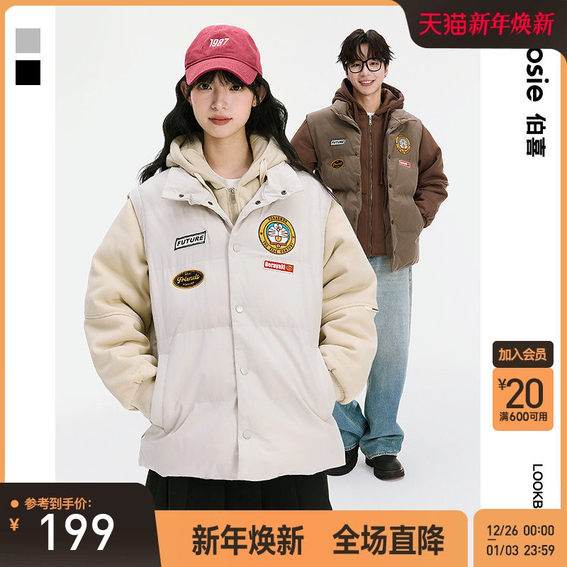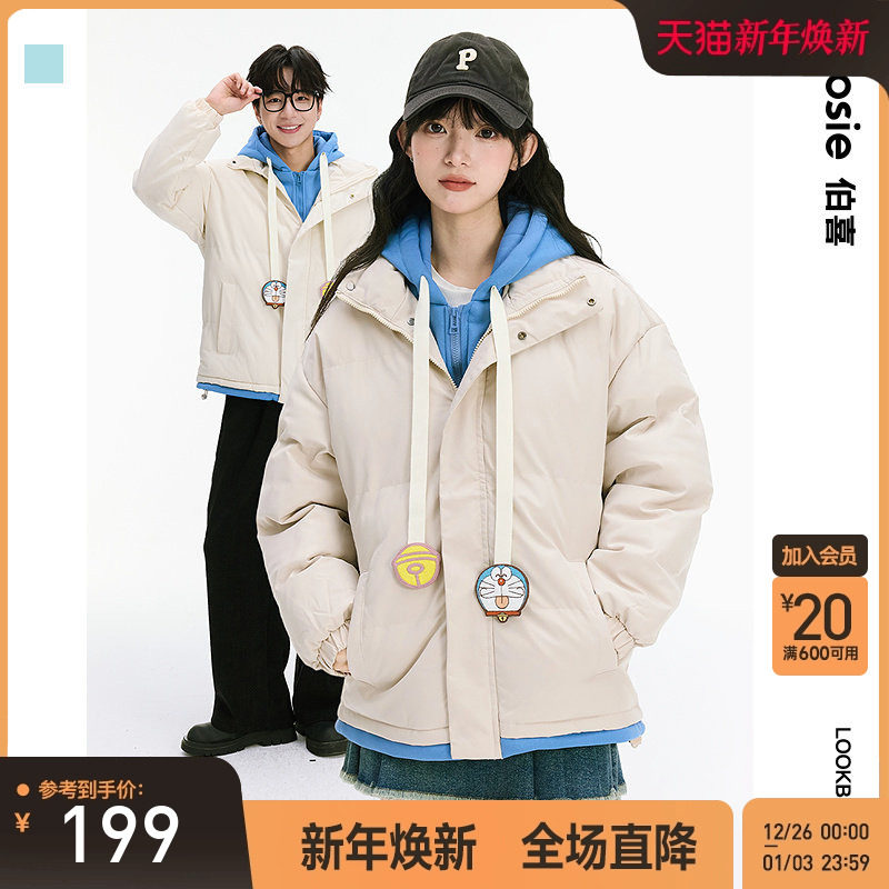bosie伯喜2025冬季新款哆啦A梦头像帽绳棉服假两件外套撞色拼接