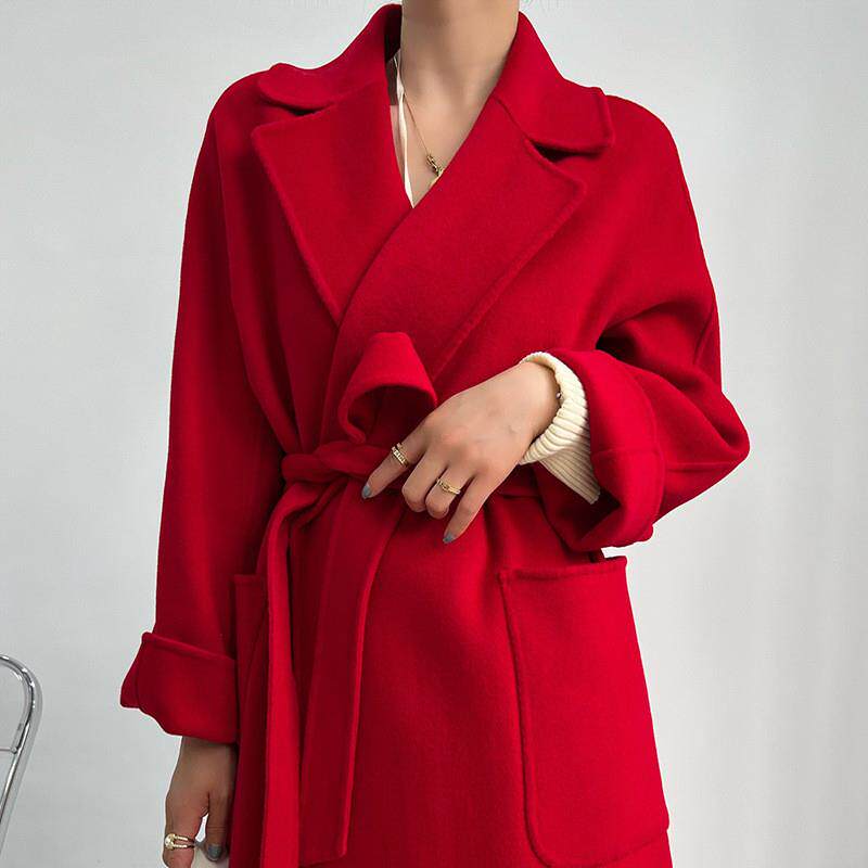 毛呢外套女中长系带收腰高端气质大红色无羊绒秋冬新款双面呢大衣