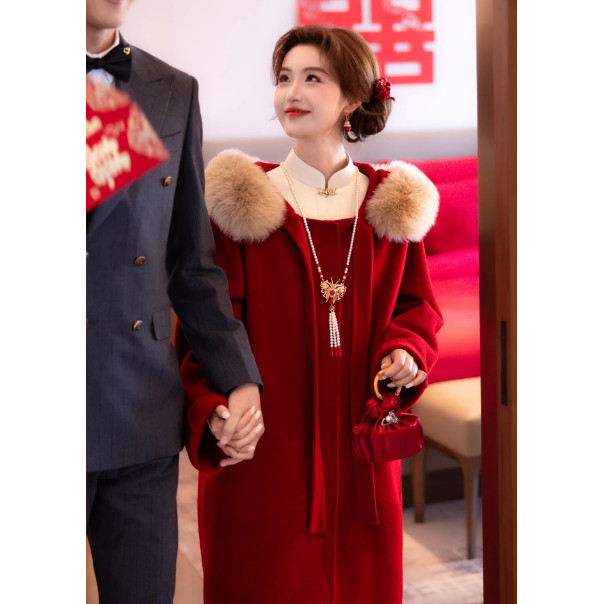 大红色毛呢保暖外套女连帽大毛领大衣冬季新年敬酒礼服中式新娘冬