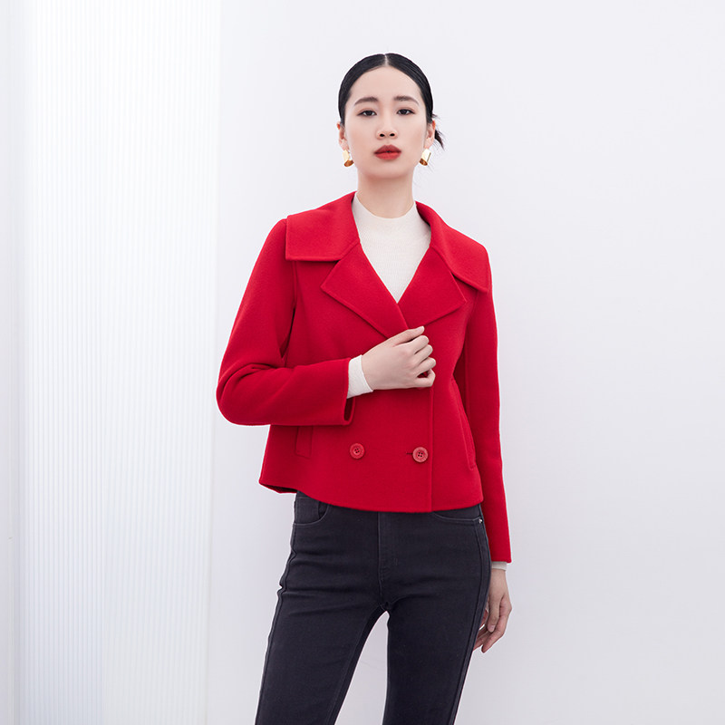 诗梦女装冬季大红色短款双面呢大衣羊毛羊绒大翻领甜美减龄短外套