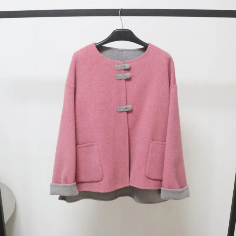 欧洲站2025秋冬新款国风圆领盘扣钉钻时尚百搭澳毛长袖呢子大衣女