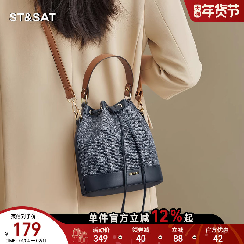 星期六2025新款复古超火牛仔老花抽绳小水桶包手提百搭单肩斜挎包