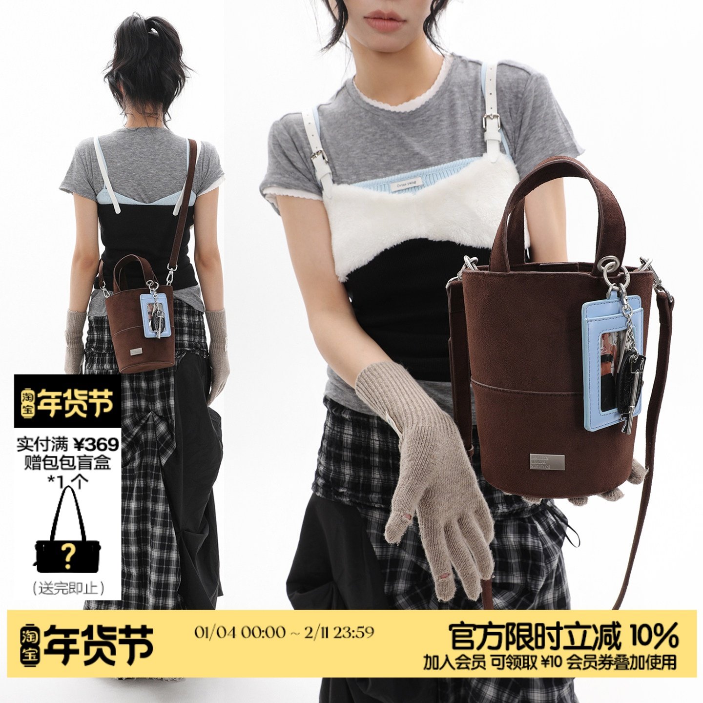 简着25AW 原创 黑粉 里尼墩墩小水桶包 麂皮绒含挂饰手提斜挎包