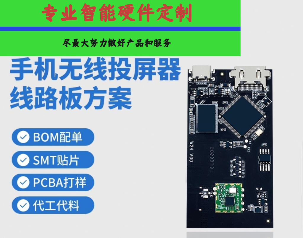 HDMI无线同屏器2.4G推送宝跨境手机投屏器方案PCBA主板开发定制