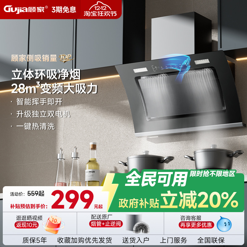 顾家抽油烟家用双电机大吸力厨房抽烟机机侧吸式自动清洗吸油烟机