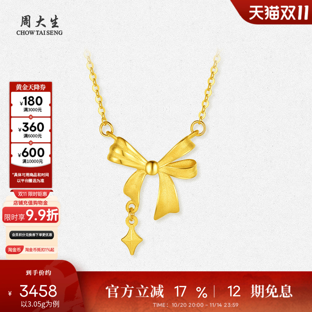 周大生黄金项链女5G足金星芒蝴蝶结套链吊坠锁骨O字链送女友礼物