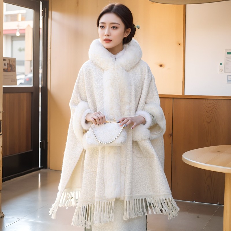 高级感秋冬加厚斗篷披肩毛领连帽百搭民族风中长款流苏外套女披风