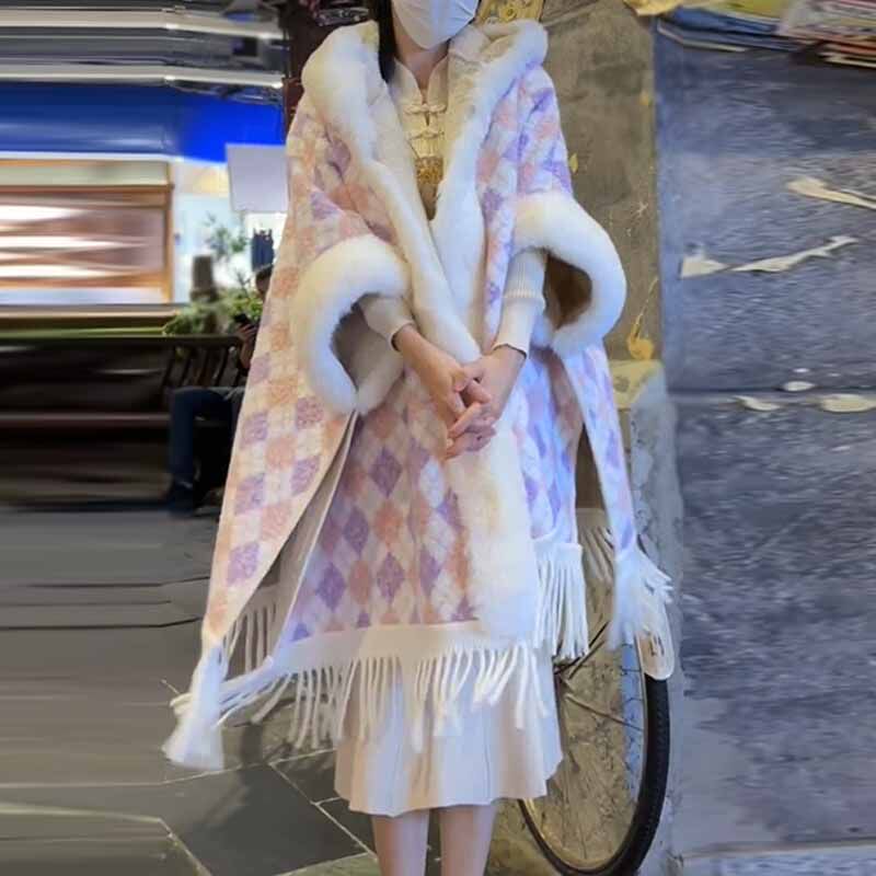秋冬大码连帽加绒加厚毛领斗篷披肩女中长款流苏菱格毛呢外套披风