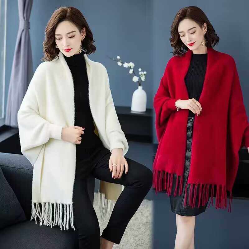 2024秋冬新款女装针织开衫中长款韩版流苏斗篷披肩毛衣外套女披风