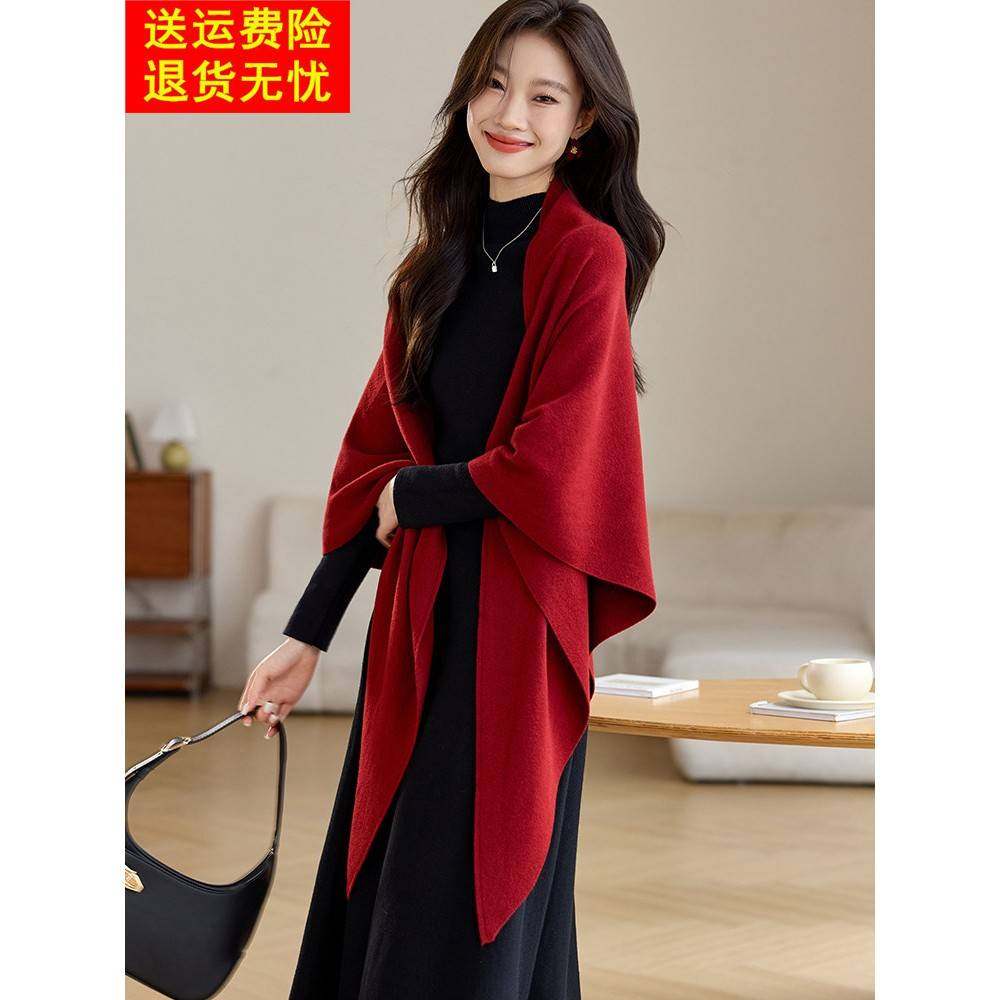 2025秋冬新款红色中长款宽松针织披肩女洋气时髦气质外搭斗篷外套