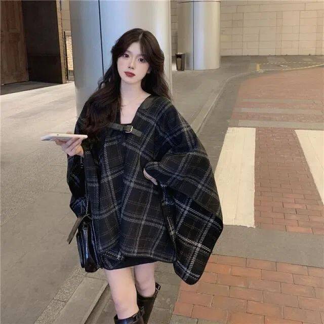小香风黑色中长款格子毛呢外套女秋冬宽松百搭小个子斗篷披肩大衣