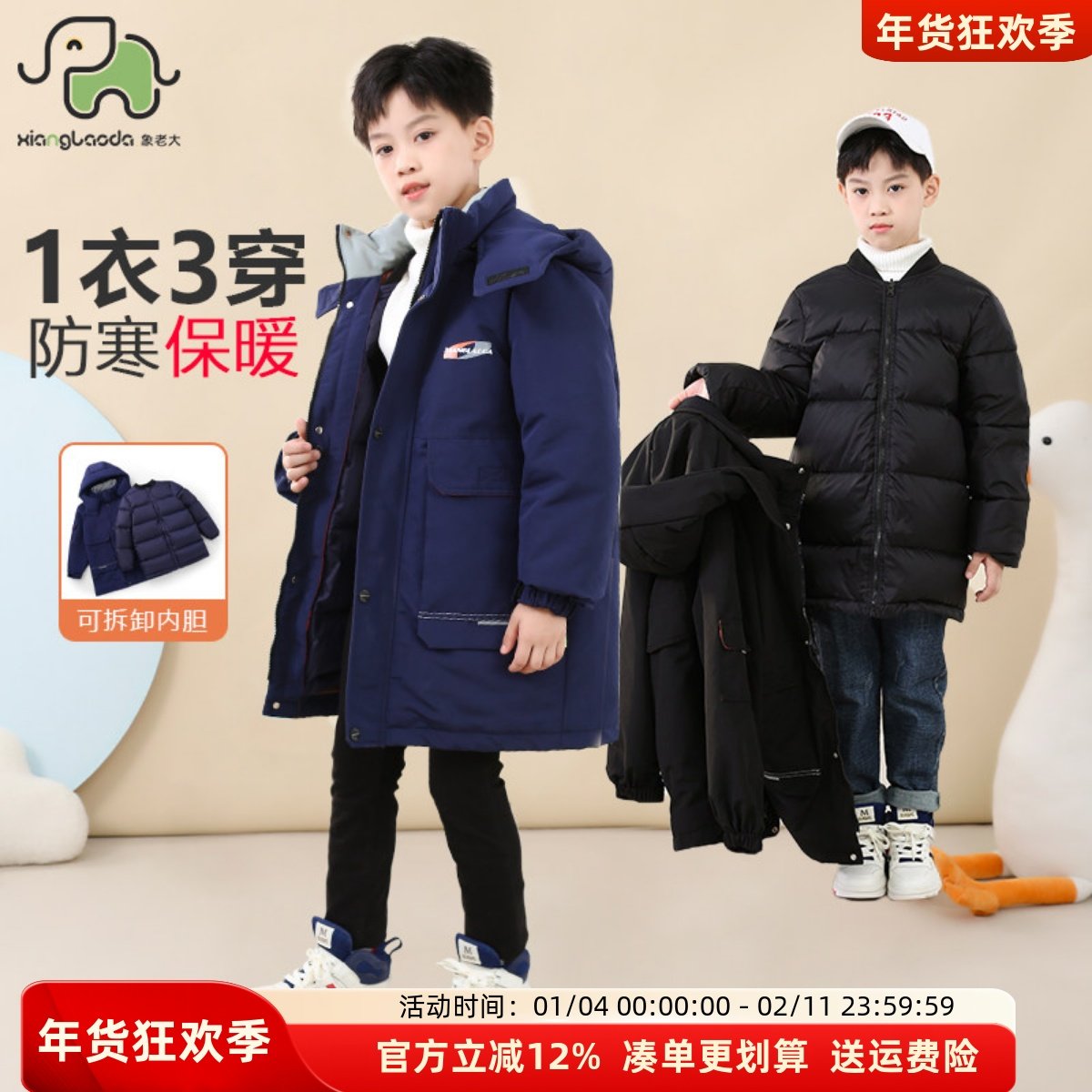 象老大儿童羽绒服中长款加厚防风可拆卸两件套2025男大童冬装外套