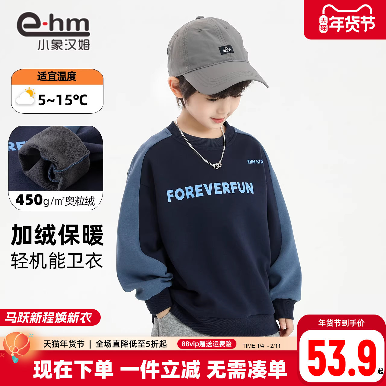 小象汉姆童装男童加绒卫衣儿童冬装2026新款长袖冬款中大童上衣