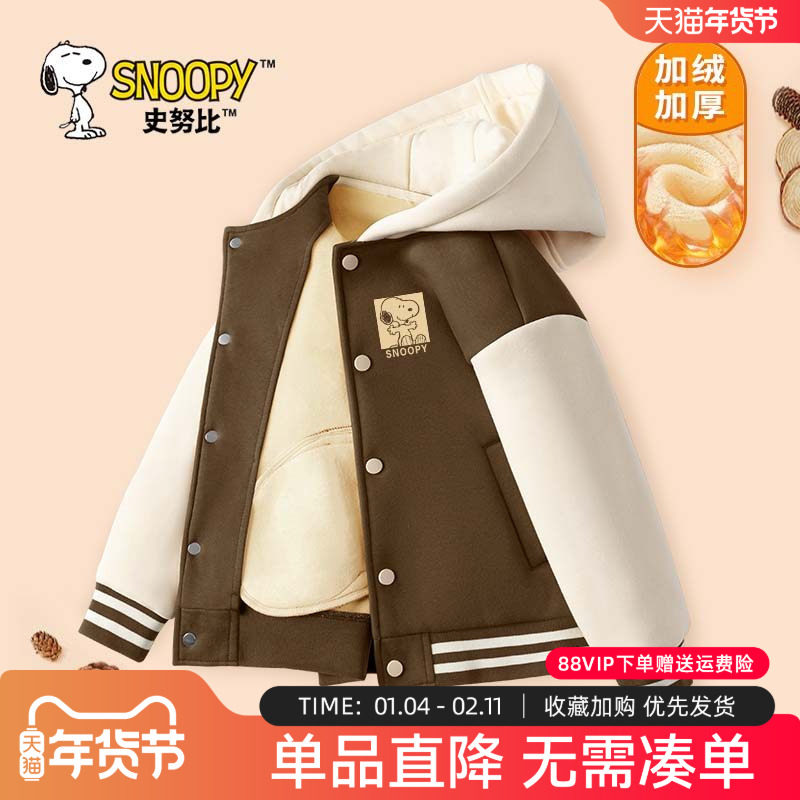 史努比童装男童加绒外套秋冬款男大童冬装上衣连帽棒球服儿童衣服