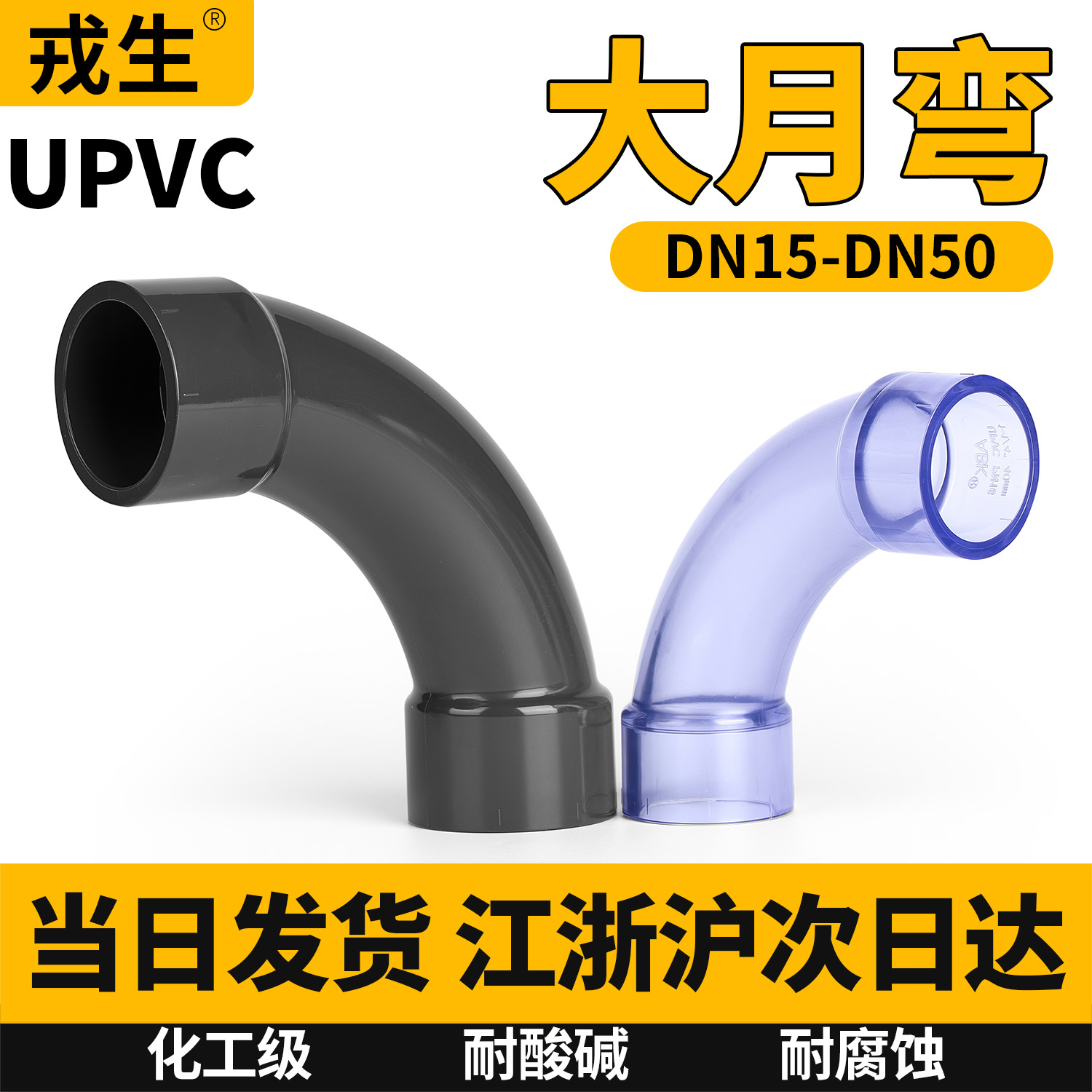 戎生UPVC大月弯透明深灰大弧度PVC管90度弯头慢弯1寸塑料水管接头