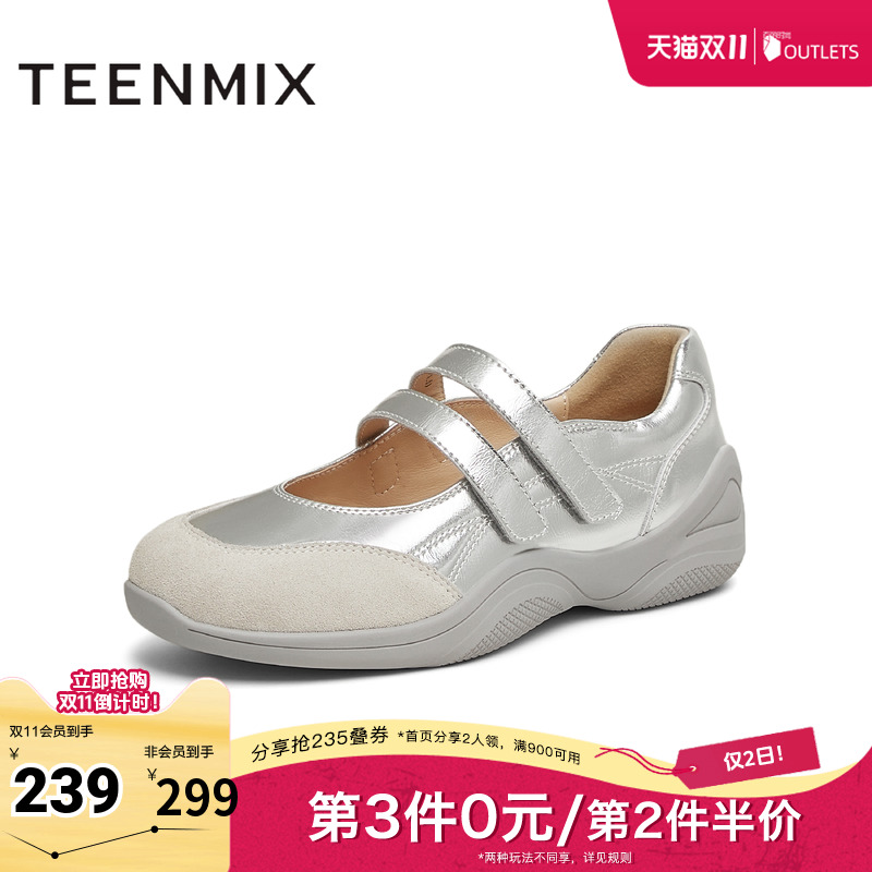 天美意银色玛丽珍皮鞋平底鞋女休闲浅口单鞋子2025秋新款KM056AA5
