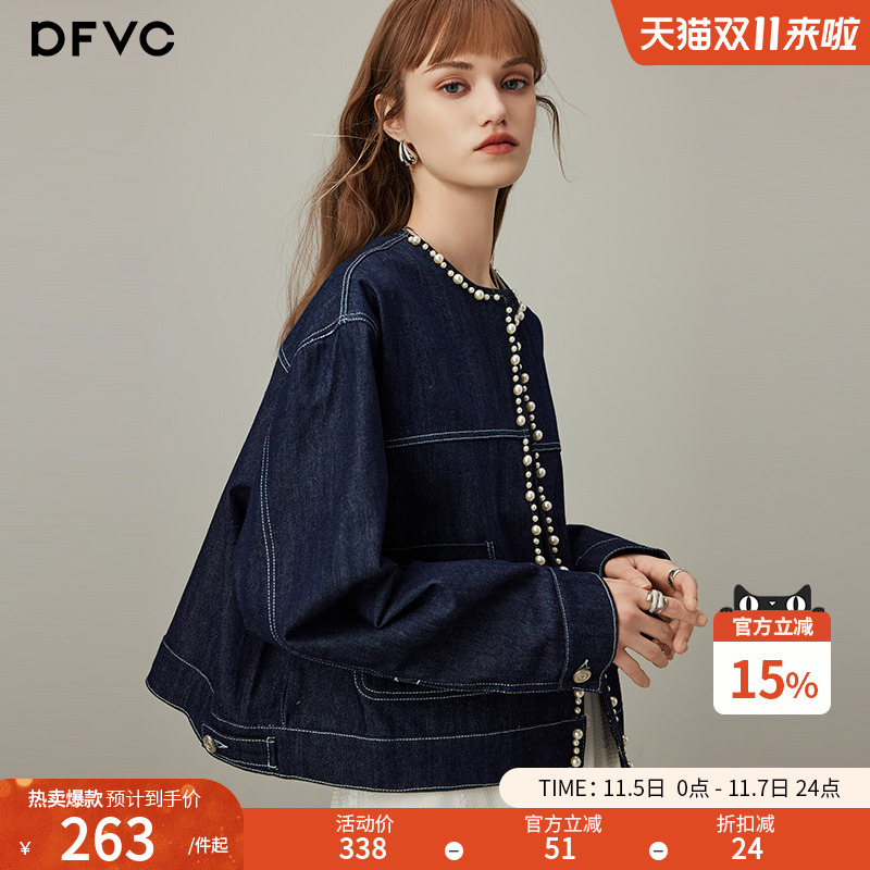 dfvc韩版短款牛仔外套女2025年秋季新款珍珠明线圆领休闲显瘦夹克